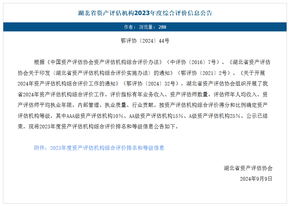 2024年9月9日,湖北省资产评估协会发布2023年度湖北省资产评估机构综合评价榜单,永业行凭借卓越的服务质量和执业水平,荣膺“AAA级资产评估机构”,位列湖北第一。